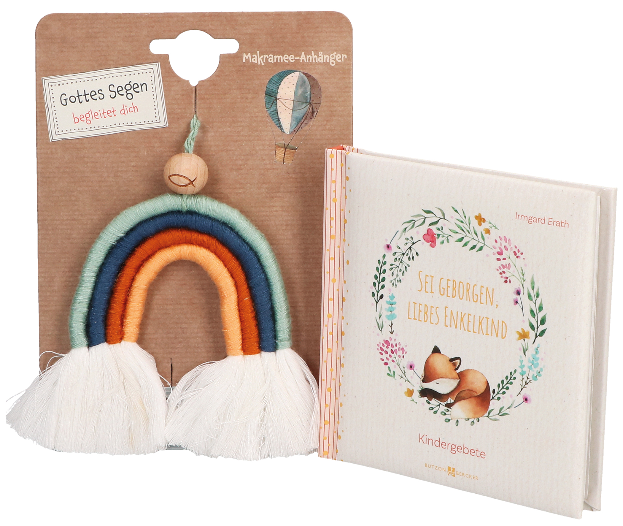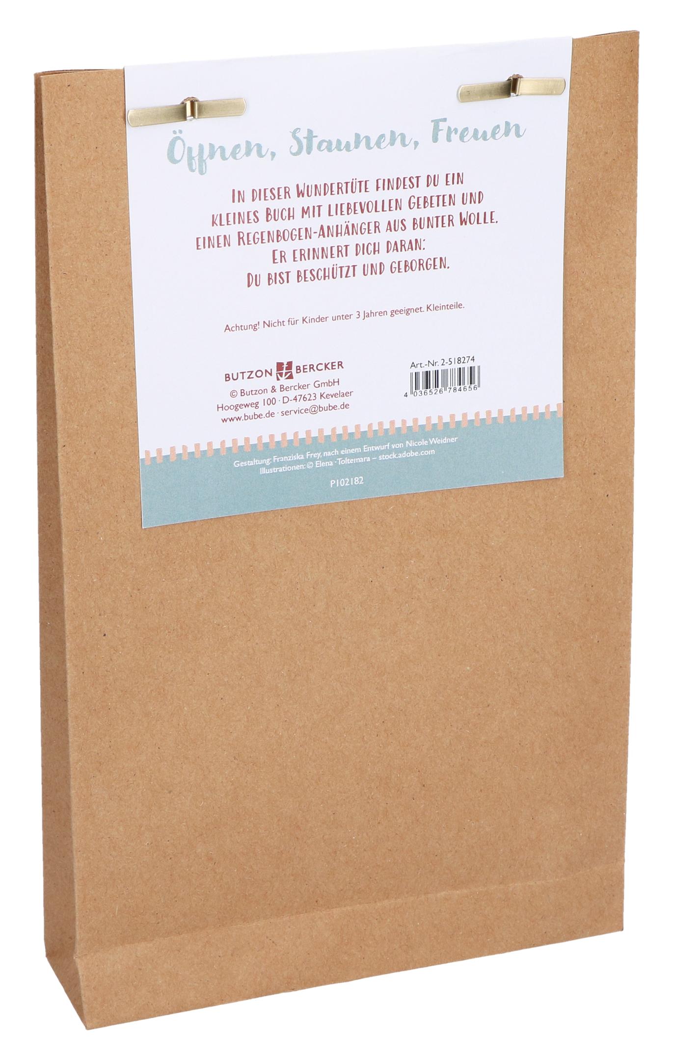 In dieser Wundertüte findest du ein kleins Buch mit liebevollen Gebeten und einen Regenbogen-Anhänger aus bunter Wolle. Er erinnert dich daran: Du bist beschützt und geborgen.