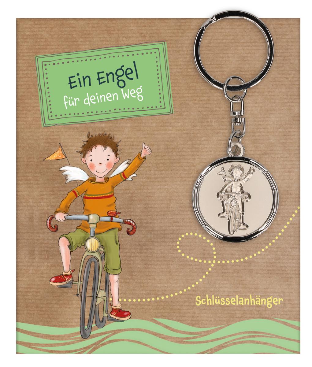 Wir liefern den praktischen Schlüsselanhänger auf einer attraktiven Verpackung mit dem Aufschrift "Ein Engel für deinen Weg". Der stilisierte Engel-Junge auf diesem Schlüsselanhänger hat kleine Flügel und sitzt auf einem Fahrrad. Als Befestigung dient ein stabiler Schlüsselring mit kleinem Scharnier, sodass der Engel immer und überall am Schlüsselbund mitgeführt werden kann.