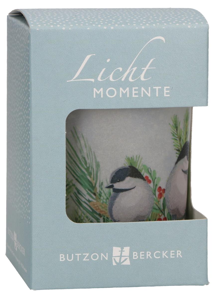 Das mundgeblasenes Glaswindlicht mit farbig bedrucktem Pergamentumleger, Lieferung in türkiser Geschenkverpackung mit weißem Teelicht.