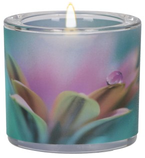 Das Glaswindlicht ziert eine vierfarbig bedruckte Banderole mit Blumenmotiv. Sie strahlt Zuversicht aus und zeigt mit dem Text "Je schöner und voller die Erinnerungen, desto schwerer ist die Trennung. Aber die Dankbarkeit verwandelt die Qual der Erinnerung in eine stille Freude.", dass Liebe weit über Tod und Trauer hinaus lebendig bleibt. Das Glaswindlicht hat einen Durchmesser von 6,5 cm, ist 6 cm hoch und wird mit einem weißen Teelicht in grüner Geschenkverpackung geliefert.