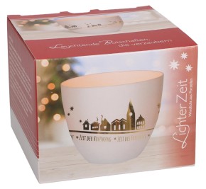 Dieses wunderschöne Windlicht aus robustem Porzellan verzaubert mit seinem eleganten Design und der liebevollen Detailverliebtheit. Es lässt das Herz höher schlagen und verströmt eine warme und gemütliche Atmosphäre zur Vorweihnachtszeit.