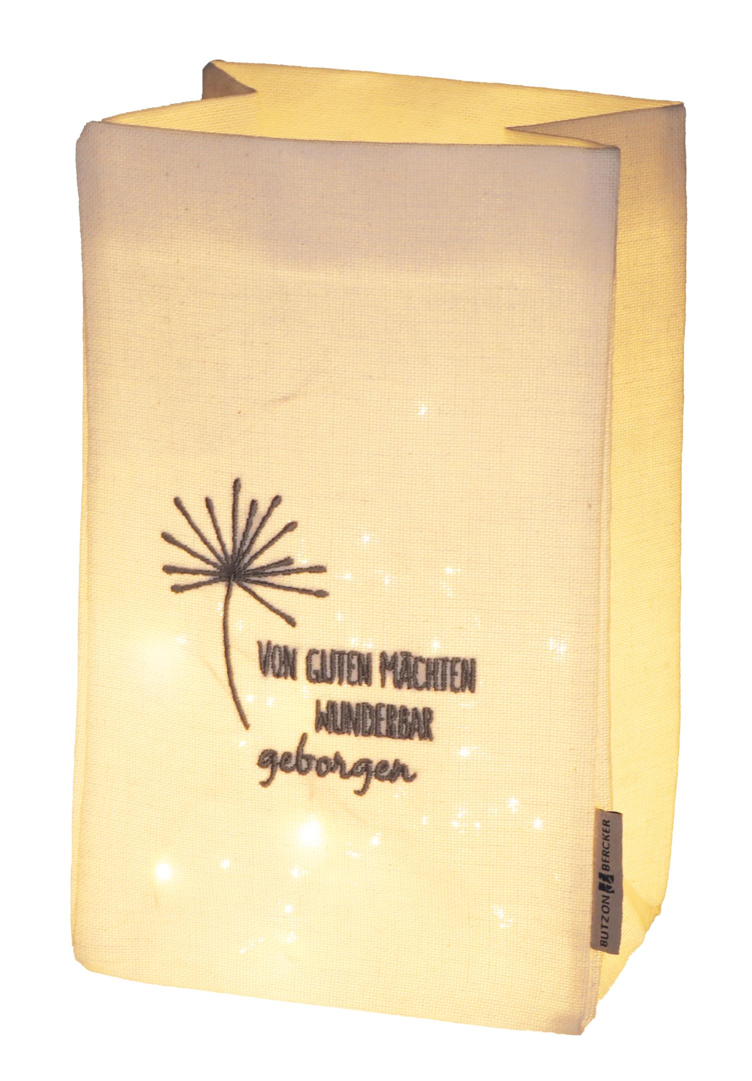 Der liebevoll gestaltete Lichtbeutel aus Stoff mit edler Bestickung "Von guten Mächten wunderbar geborgen" bringt ein Licht in jedes Zuhause. Stellt man ein kleines Teelicht im hohen Glas hinein oder aber drapiert innen eine LED-Lichterkette, so scheint ein sanftes Licht durch den lichtdurchlässigen Stoff hindurch. Diese schöne Dekoration, Geschenkidee oder Mitbringsel erhellt jedes Zuhause und zaubert eine angenehme, behagliche Atmosphäre. Bitte