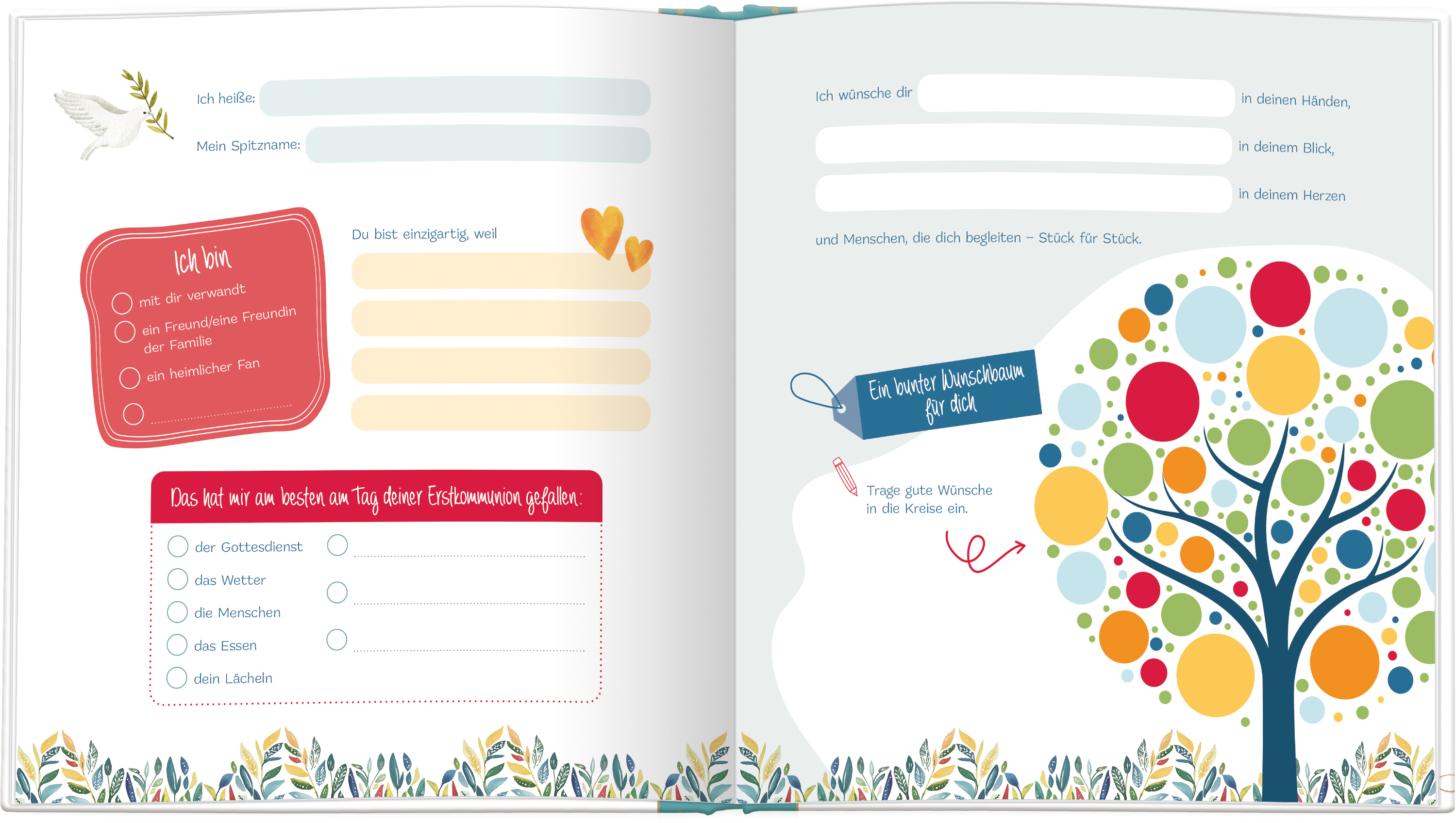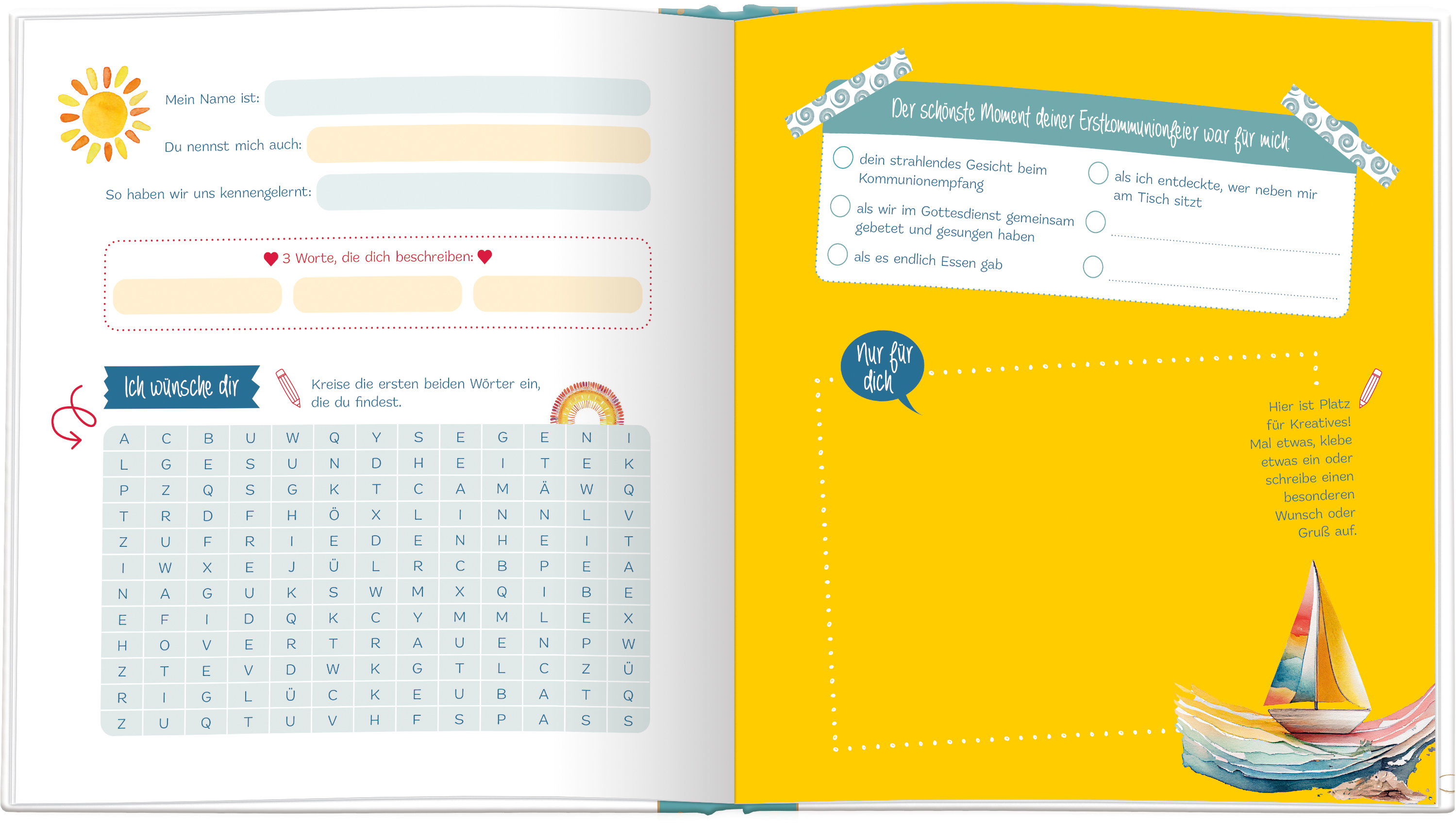 Ob schreiben, ankreuzen, einkreisen, malen oder einfach nur einen Fingerabdruck hinterlassen – dieses Buch lädt alle Gäste ein, sich auf kreative Art und Weise zu verewigen. Dank vorgefertigter Fragen und verspielten Gestaltungselementen können die Gäste schnell und einfach ihre lieben Wünsche und Botschaften für das Kommunionkind eintragen.