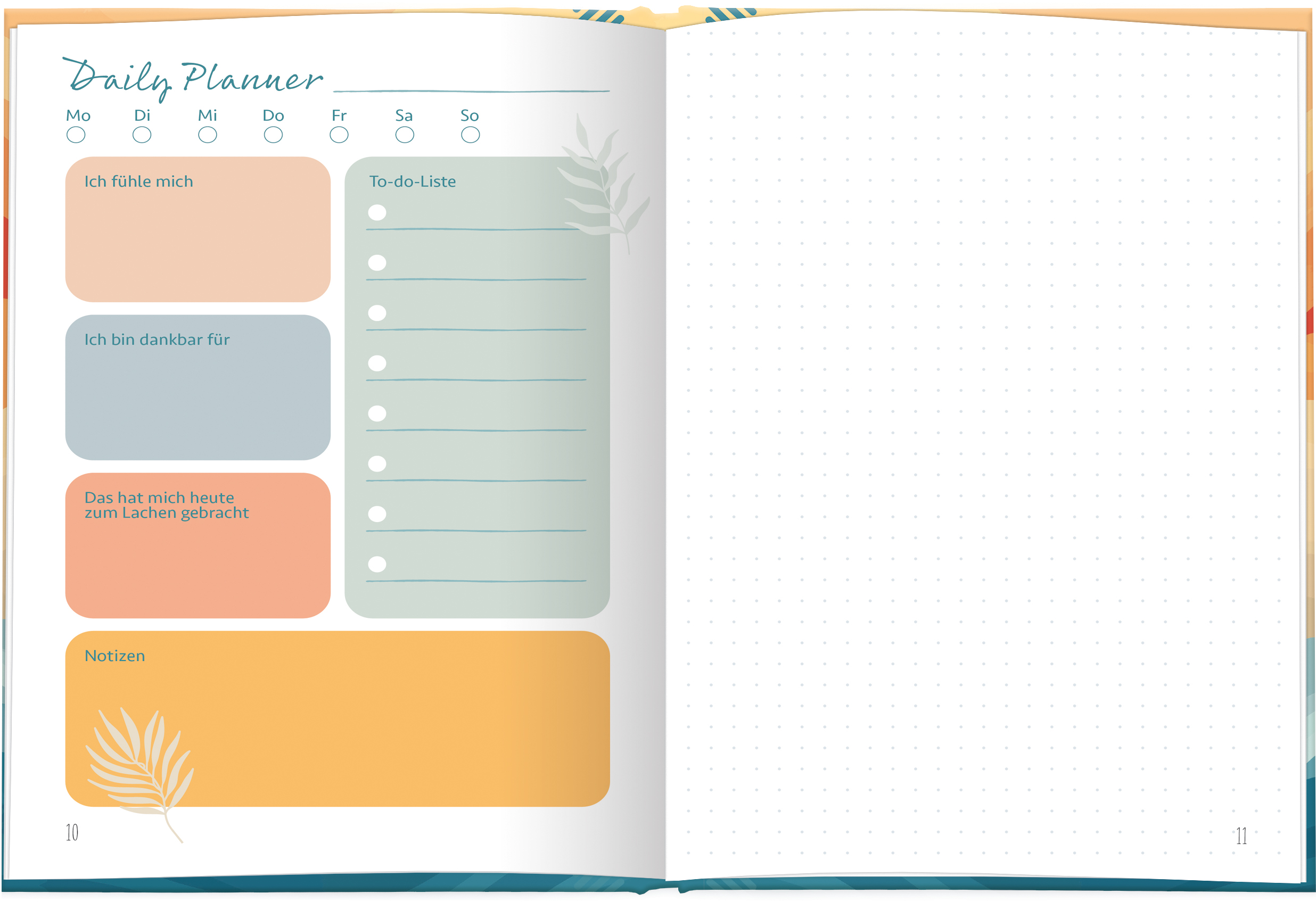 • Zahlreiche freie Seiten mit Punkteraster zum Eintragen und Gestalten