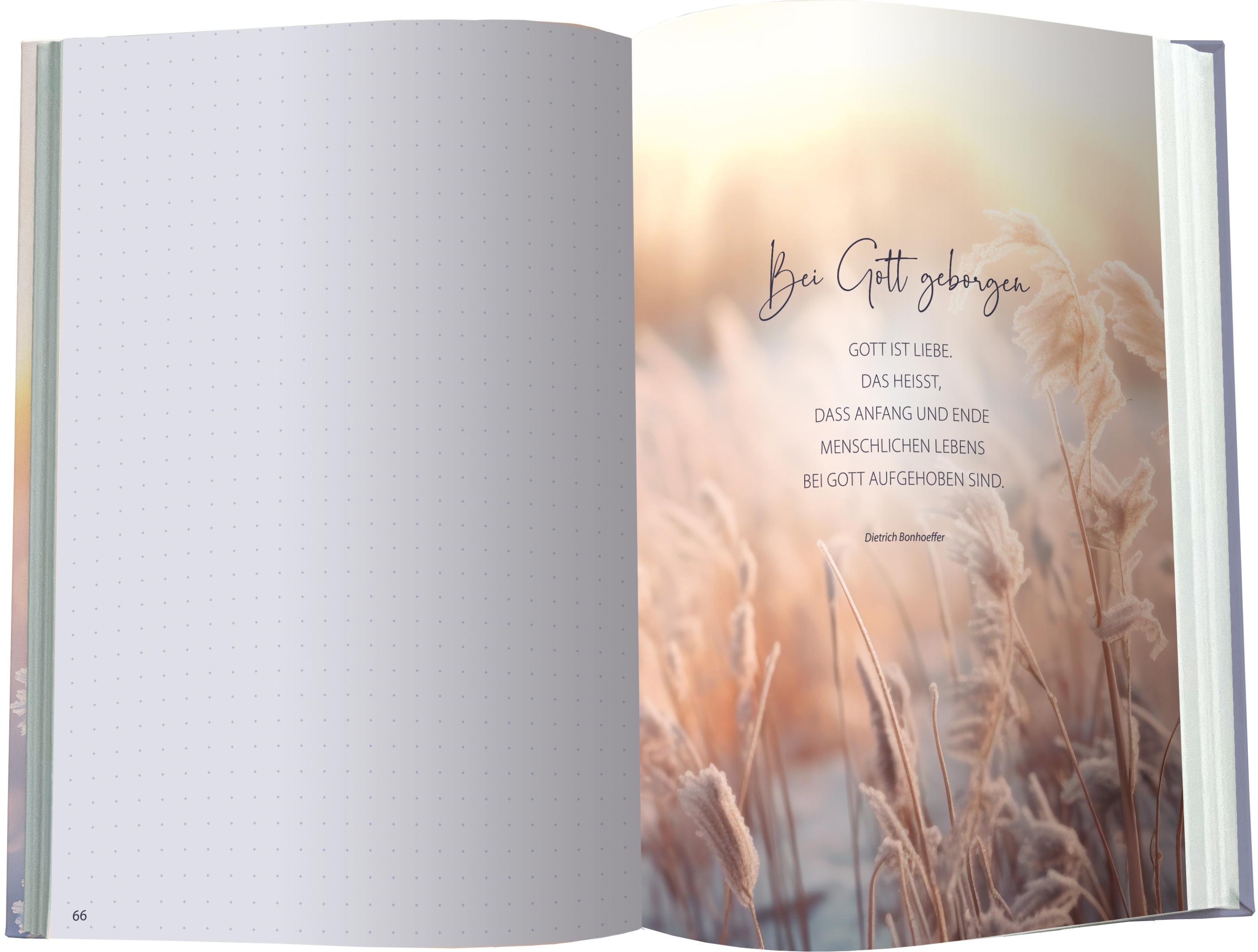 Das Besondere sind die Schmuckseiten mit tröstlichen Zitaten von Dietrich Bonhoeffer, die Halt geben und zur Reflexion, Achtsamkeit und inneren Einkehr einladen.