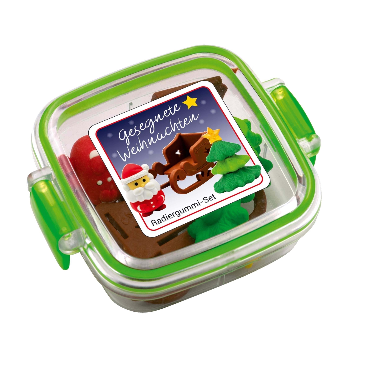 Beinahe zu schade zum Wegradieren! Gleich mehrere weihnachtliche Radiergummis lassen sich mit dem Radiergummi-Set „Gesegnete Weihnachten“ verschenken. Das mehrteilige Set besteht aus „Weihnachtsbaum“ (Maße ca. 3x 3,9 x 3 cm) „Weihnachtsmann“ (Maße ca. 1,8 x 3,4 x 1,9 cm), sowie dem passenden Schlitten zum Zusammenbauen (Maße aufgebaut ca. 5 x 2,9 x 2,9 cm). Alles zusammen ergibt eine fröhliche, weihnachtliche Szene. Zudem besonders praktisch: Nach dem Gebrauch können die kleinen Radiergummis wieder sicher in der Box (Maße 7,8 x 6,8 x 2,8 cm) verstaut werden.