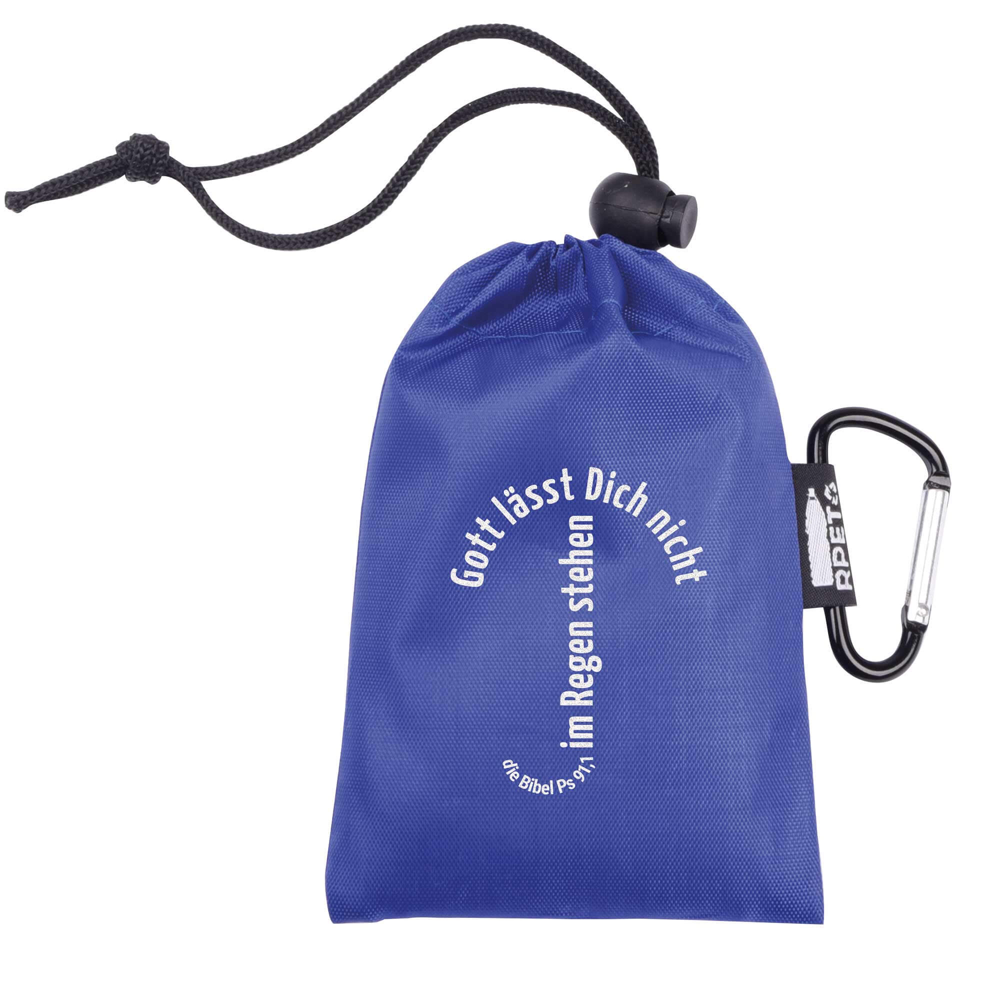 Der Regenponcho mit Kapuze ist ein idealer Begleiter für Ausflüge, wenn das Wetter mal nicht mitspielt. Besonders praktisch: Der Poncho wird in einem kleinen RPET-Beutel geliefert, der mittels eines Karabiners befestigt werden kann. So hat man den Poncho immer griffbereit zur Hand. Bedruckt ist der handliche Beutel, 8 x 12 cm, mit „Gott lässt dich nicht im Regen   die Bibel 91,1“ Erhältlich in vier verschiedenen Farben