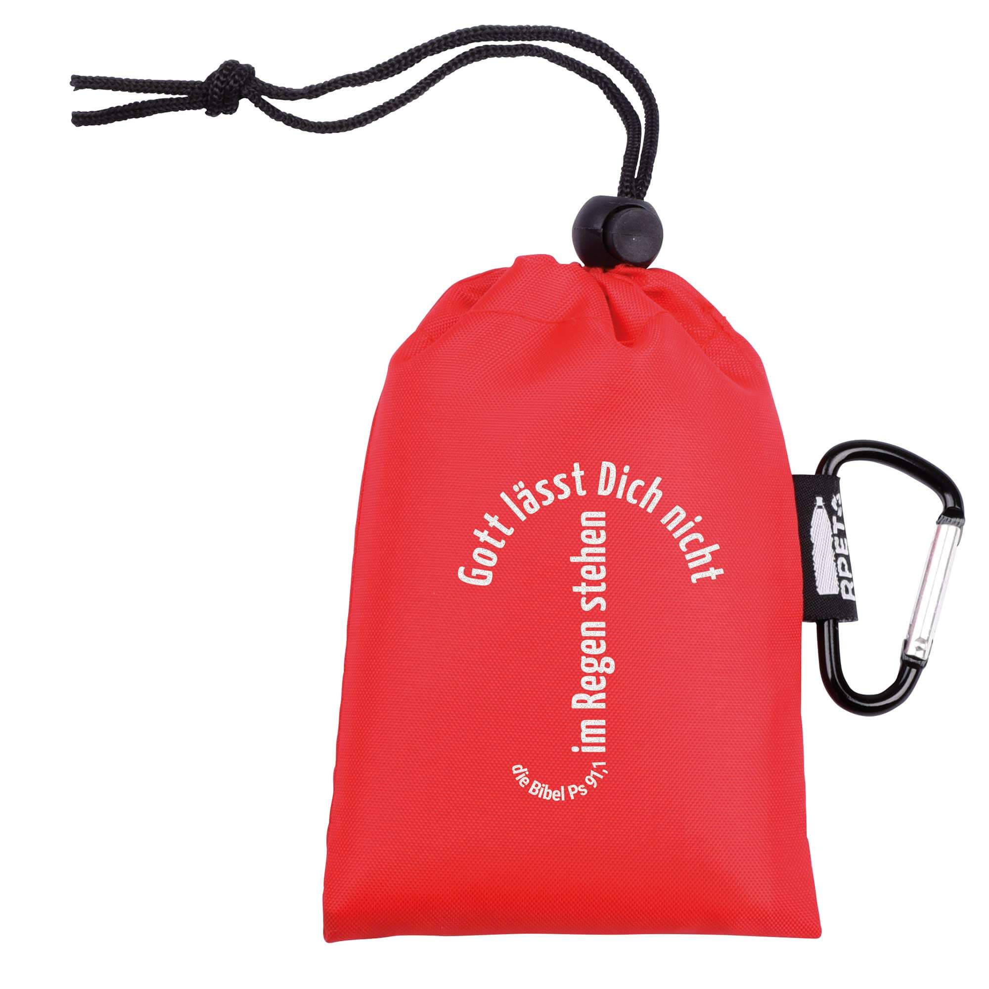 Der Regenponcho mit Kapuze ist ein idealer Begleiter für Ausflüge, wenn das Wetter mal nicht mitspielt. Besonders praktisch: Der Poncho wird in einem kleinen RPET-Beutel geliefert, der mittels eines Karabiners befestigt werden kann. So hat man den Poncho immer griffbereit zur Hand. Bedruckt ist der handliche Beutel, 8 x 12 cm, mit „Gott lässt dich nicht im Regen die Bibel 91,1“ Erhältlich in vier verschiedenen Farben