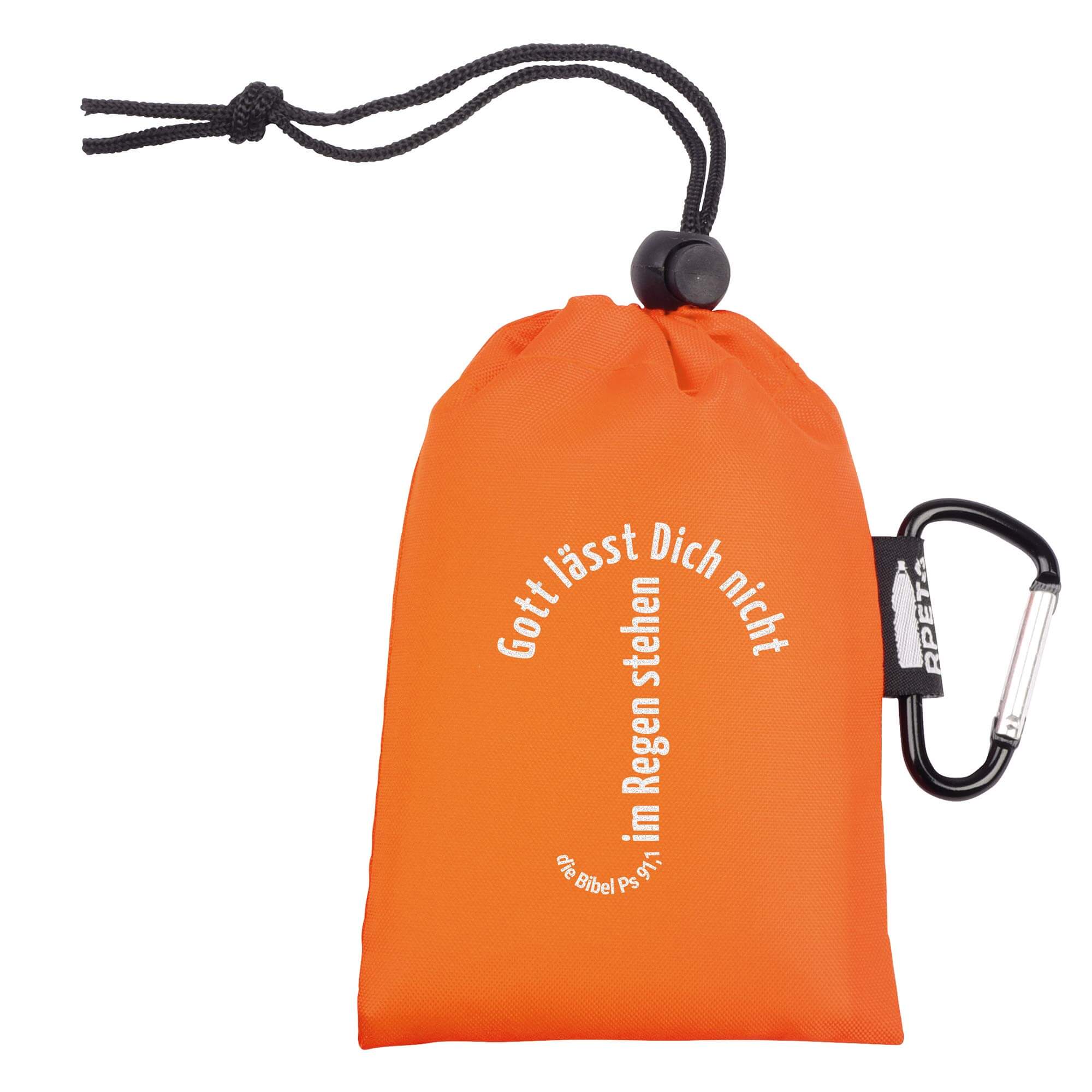 Der Regenponcho mit Kapuze ist ein idealer Begleiter für Ausflüge, wenn das Wetter mal nicht mitspielt. Besonders praktisch: Der Poncho wird in einem kleinen RPET-Beutel geliefert, der mittels eines Karabiners befestigt werden kann. So hat man den Poncho immer griffbereit zur Hand. Bedruckt ist der handliche Beutel, 8 x 12 cm, mit „Gott lässt dich nicht im Regen die Bibel 91,1“ Erhältlich in vier verschiedenen Farben