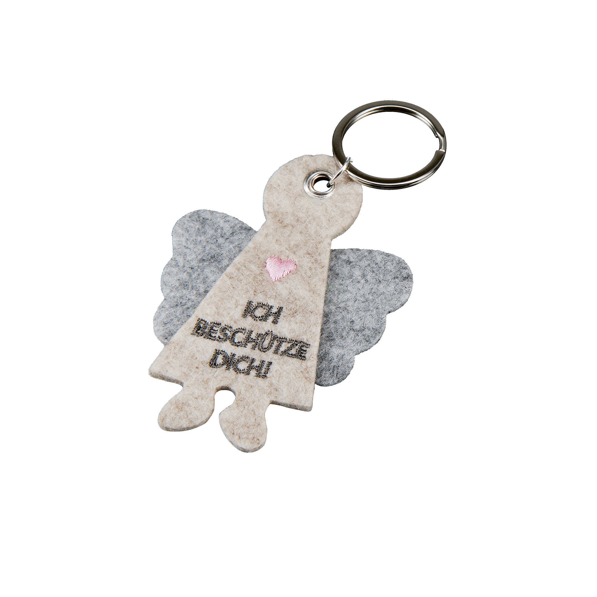 Als freundlicher, kleiner Begleiter mit Mut machenden Aussagen für den Alltag ist der Schlüsselanhänger „Schutzengel“ ideal. Erhältlich ist der kleine Engel aus hellem Filz in zwei verschiedenen Varianten. Fein bestickt mit „Ich beschütze dich!“ oder „Ich begleite dich!“ Die niedliche, rosafarbene Herz-Applikation verleiht ihm zudem einen freundlichen Charme. Größe ca. 8 x 6,5 cm.