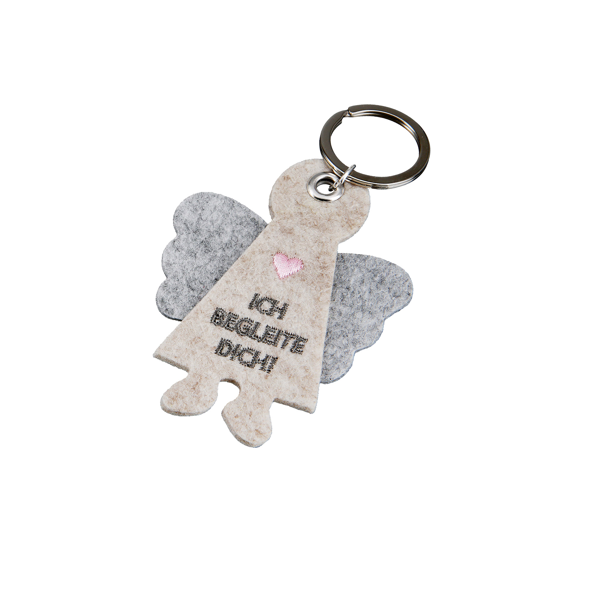Als freundlicher, kleiner Begleiter mit Mut machenden Aussagen für den Alltag ist der Schlüsselanhänger „Schutzengel“ ideal. Erhältlich ist der kleine Engel aus hellem Filz in zwei verschiedenen Varianten. Fein bestickt mit „Ich beschütze dich!“ oder „Ich begleite dich!“ Die niedliche, rosafarbene Herz-Applikation verleiht ihm zudem einen freundlichen Charme. Größe ca. 8 x 6,5 cm.
