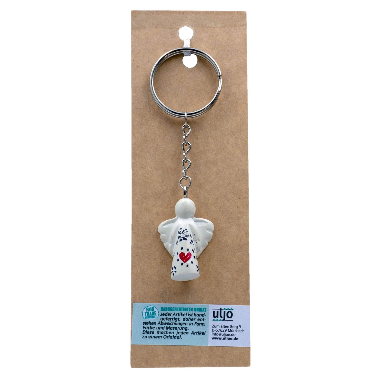 Handgefertigter Schutzengel aus Speckstein, jedes Stück ein Unikat. Ein liebevoller Alltagsbegleiter und schönes Geschenk. Die kleinen Engel werden in kenianischen Dörfern gefertigt. Unser Lieferant garantiert die Unterstützung der Handwerker vor Ort. Höhe Engel: ca. 3,5 cm, Gesamtlänge Schlüsselanhänger: ca. 10 cm.   FAIR GEHANDELT ! Unser Specksteinlieferant lässt alle unsere Specksteinprodukte in Dörfern in Kenia anfertigen. Er garantiert dafür, dass das Geld bei den Handwerkern ankommt und diese damit ihre Familien ernähren können. Dafür wurde der Lieferant als Fair-Trade-Partner ausgezeichnet.