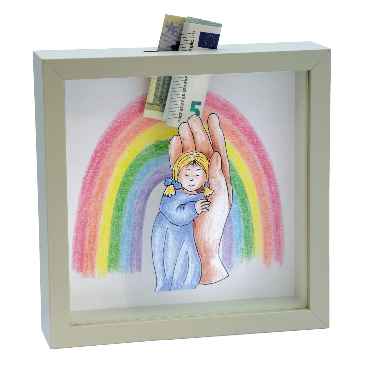 Dekorative Spardose mit liebevoller Symbolik. Die Kinderfigur liegt geborgen in einer Hand, umgeben von einem Regenbogen. Auf weißem MDF-Holz hinter Glas.