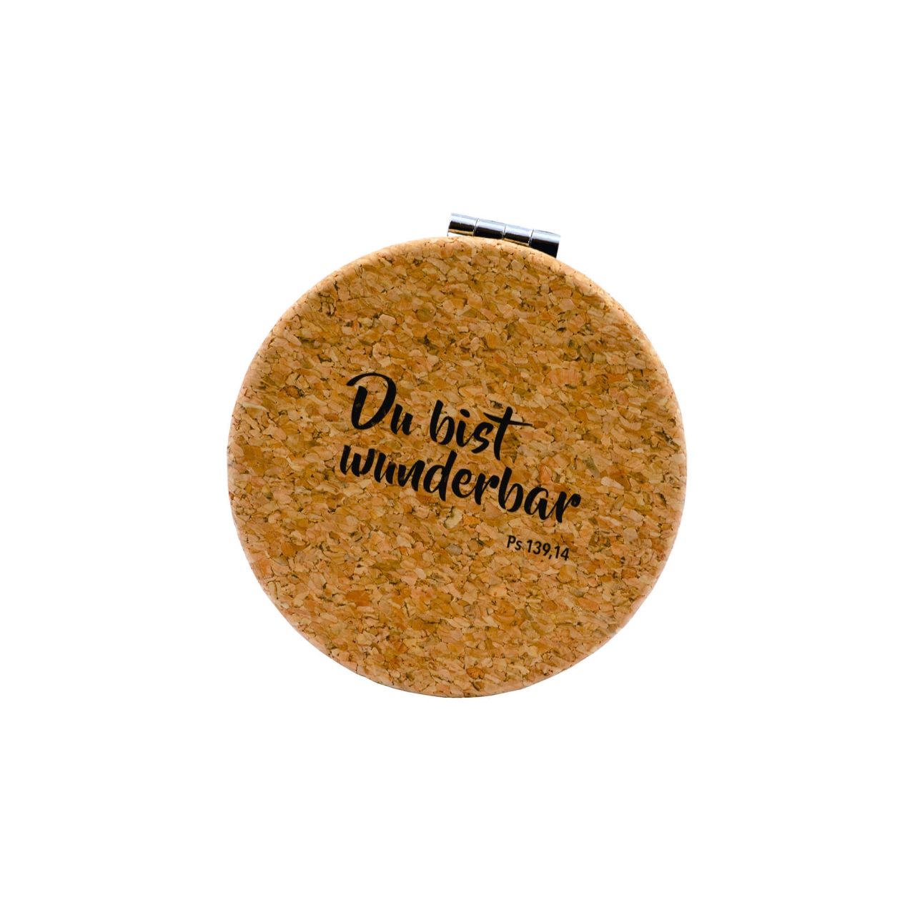 Hochwertiger Doppelspiegel aus Metall mit Korkummantelung und bedruckten Deckel, mit dem Vers „Du bist wunderbar Ps 139,14“. Innen mit Normal- und Vergrößerungsspiegel. Ideal geeignet für Handtaschen oder auf Reisen. Plastikfrei verpackt in einer Kraftpapierschachtel. Größe Spiegel:  ø  ca. 7 cm.