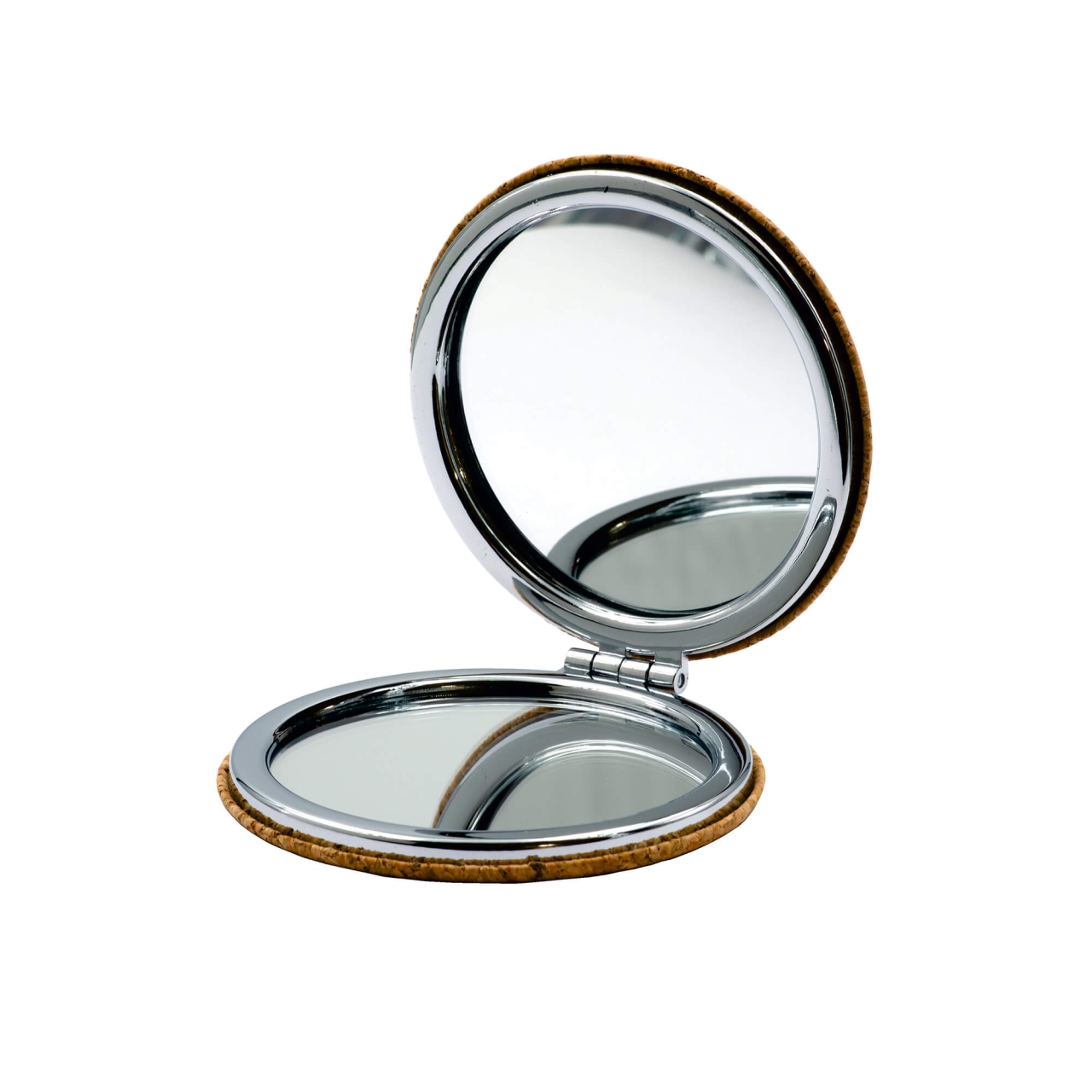 Hochwertiger Taschenspiegel aus Metall mit Korkummantelung. Innen mit Normal- und Vergrößerungsspiegel. Ideal geeignet für Handtaschen oder auf Reisen.