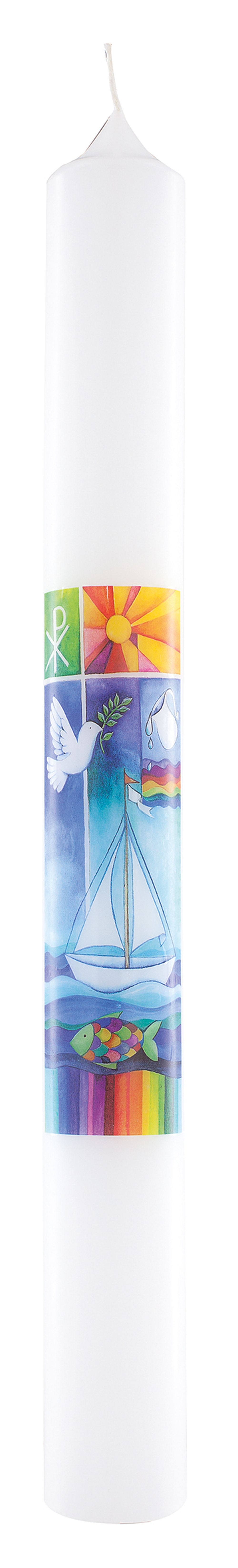 Gottes Segen wird dich auf deinem Lebensweg begleiten! Mit gleich sieben Taufsymbolen – Sonne, Wasser, Taube, Regenbogen, Boot, Fisch und Christusmonogramm – verkündet diese bunte Taufkerze die frohe Botschaft. Und das lange über die Tauffeier hinaus! Dank ihrer Brenndauer von mehr als 50 Stunden kann sie auch später an Festtagen immer wieder entzündet werden. So begleitet die Kerze, die in einem stabilen Schmuckkarton geliefert wird, den Täufling als wertvolles Erinnerungsstück durch sein Leben.