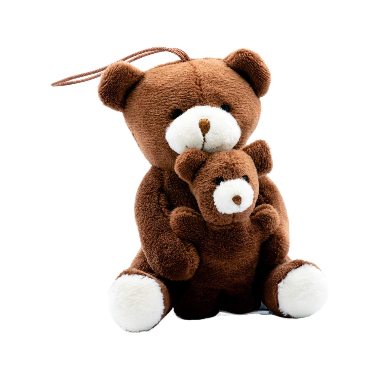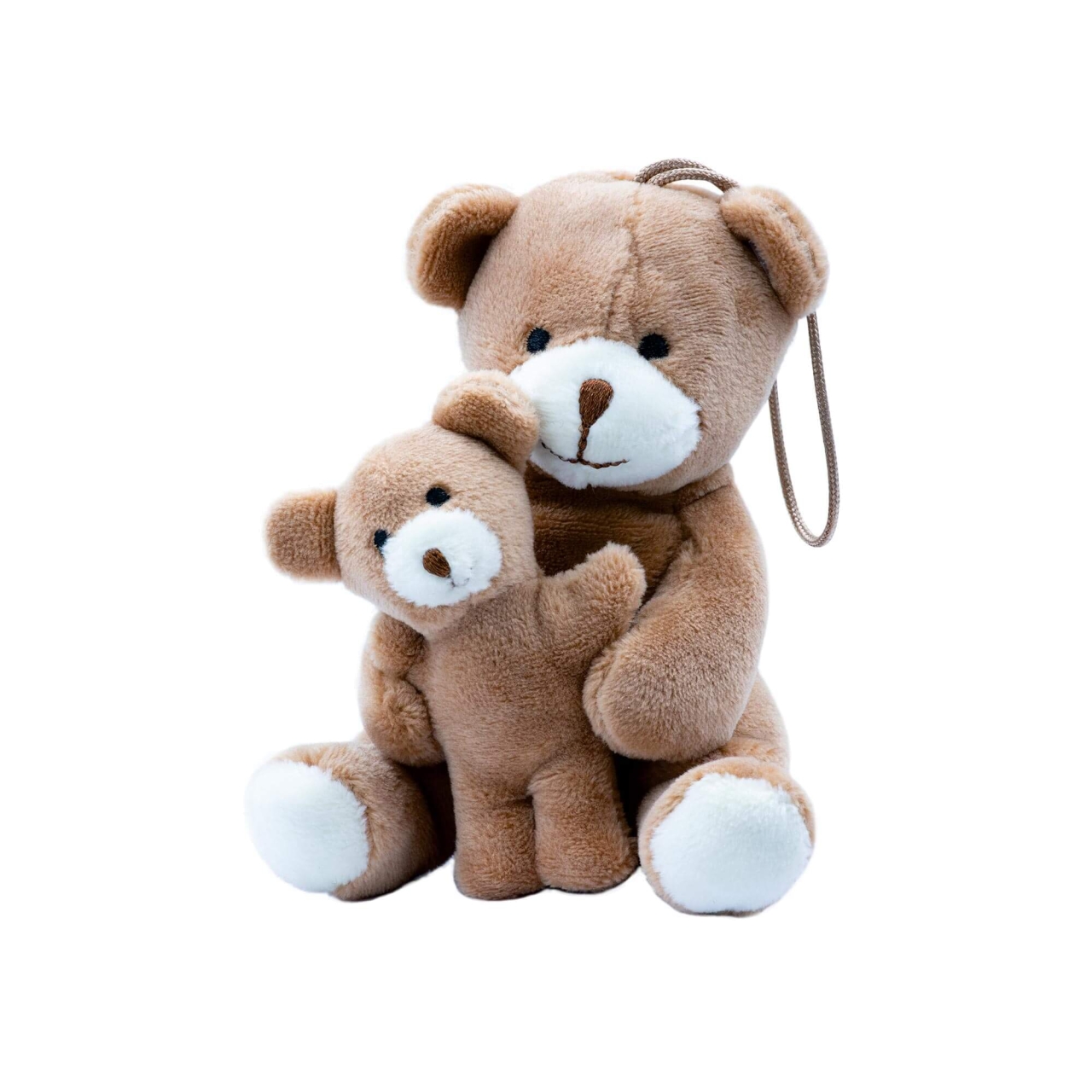Der große Teddy aus weichem Plüsch hält liebevoll den kleinen Bären im Arm. Mit praktischer Schlaufe zur einfachen Befestigung am Rucksack oder einer Tasche.