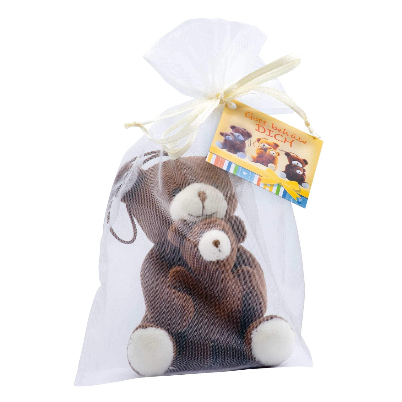 Der große Teddy hält liebevoll den kleinen Bären im Arm, begleitet von der Botschaft „Gott behüte DICH“ auf dem Schmuckkärtchen. Mit Schlaufe zur einfachen Befestigung am Rucksack oder Tasche. Sortiert in den Farben Braun, Hell- oder Dunkelbraun. Lieferung im Organzabeutel mit Schmuckkärtchen. Aus weichem Plüsch, Höhe ca. 10cm, handwaschbar bei 30 C.