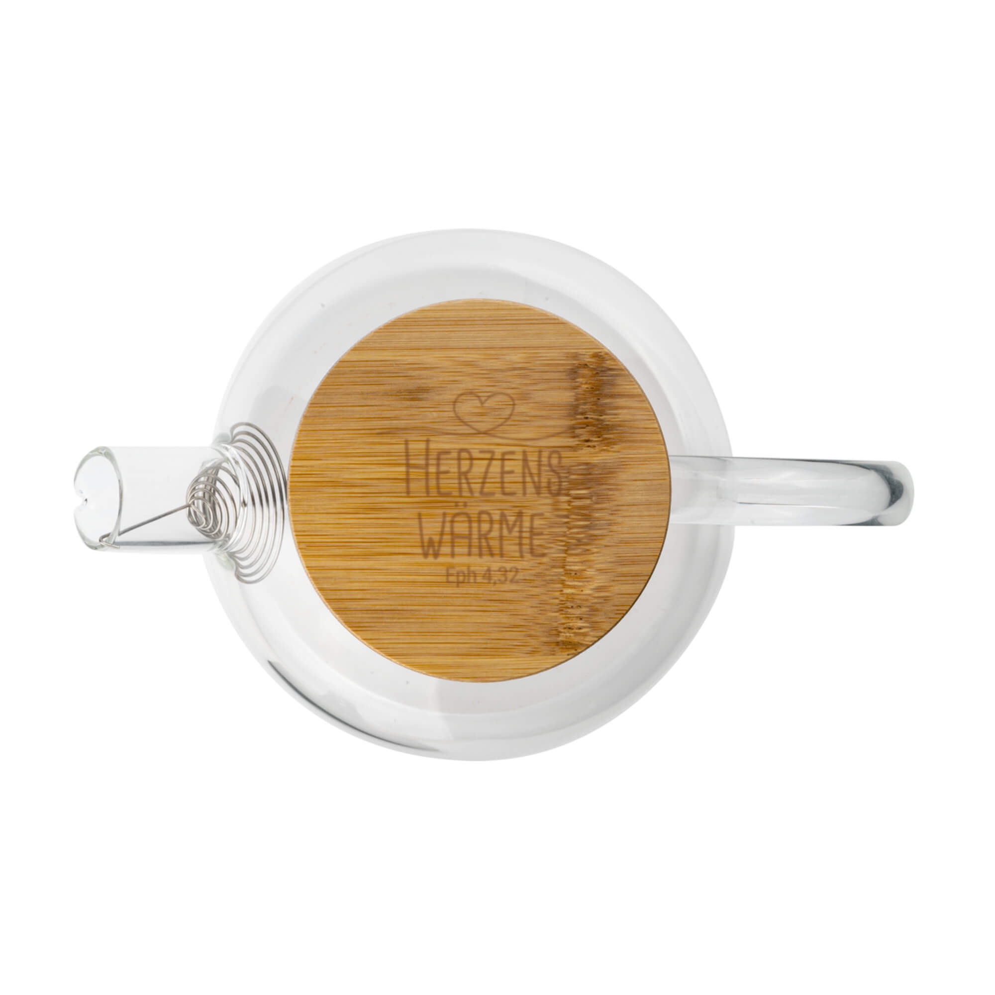 Perfekt zu unserer „Herzenswärme-Serie“ passt die schöne Teekanne aus hochwertigem Borosilikatglas. Die Kanne ist zudem mit einem Bambusdeckel und Sieb in der Tülle ausgestattet. Der Deckel ist graviert mit "Herzenswärme Eph 4,32" und verschließt die Teekanne dicht. Das Sieb eignet sich hervorragend zum Filtern von losem Tee, wie z.B. unser 3er-Tee-Set (Art.-Nr. 9581) aus der gleichnahmigen Serie "Herzenswärme". Die Kanne hat ein Fassungsvermögen von ca. 800 ml und  ist spülmaschinenfest. Maße ca. 19 cm (Länge) 12 cm (Höhe) 13 cm (Breite)