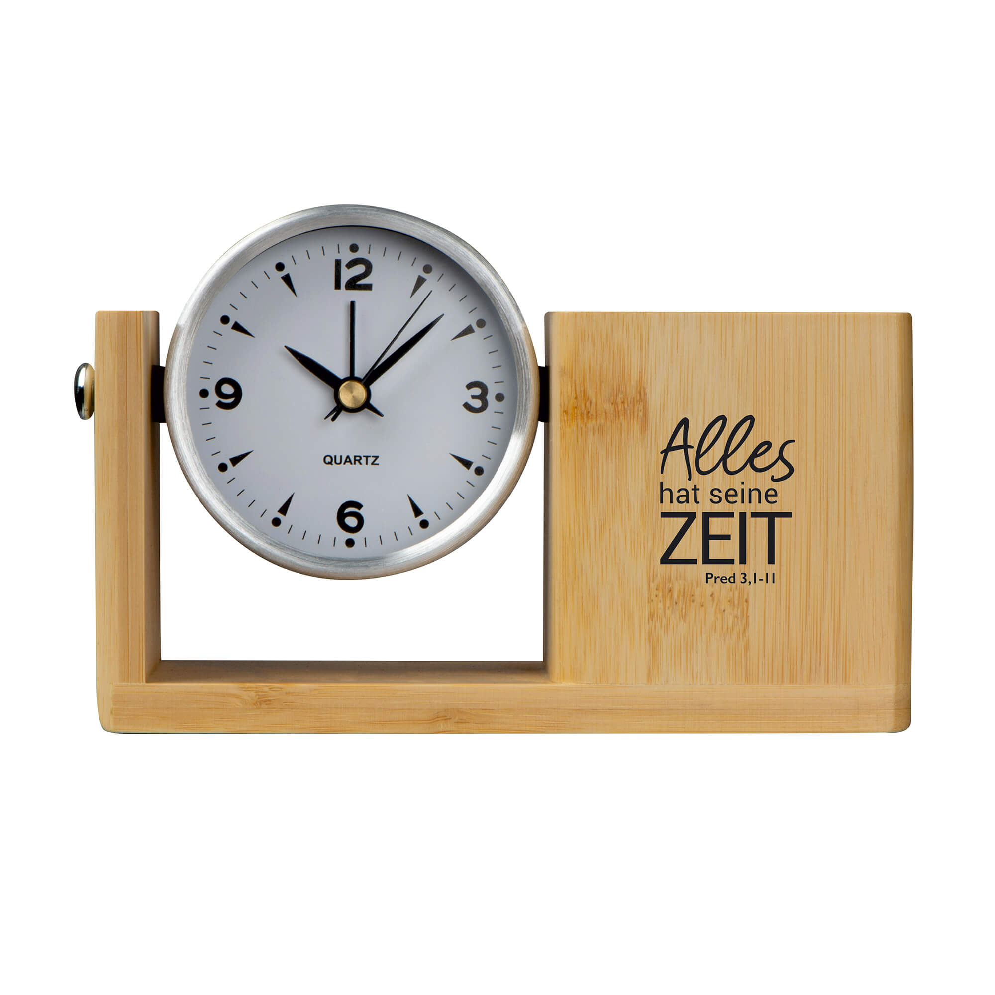 Elegantes Design und praktische Funktionalität vereint die Tischuhr mit integriertem Stifteköcher. Die analoge Uhr aus Aluminium kann geschwenkt werden, um den Blickwinkel anzupassen und das Ablesen der Uhrzeit zu erleichtern. Der Stifteköcher sorgt für Ordnung und schnellen Zugriff auf die Schreibutensilien. Die schicke Tischuhr mit dem naturfarbenen Bambuselement ist ein stilvolles Accessoire für jeden Schreibtisch. Der stimmige Aufdruck „Alles hat seine Zeit … Pred 3,1-11“ macht sie zu einem außergewöhnlichen Geschenk. Material: Bambus und Aluminium, Größe: LxBxH ca. 17 x 7,5 x 11 cm. Benötigt für den Gebrauch: 1 Batterie Typ LR6 (AA) 1,5V (nicht im Lieferumfang enthalten).