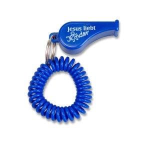 Trillerpfeife aus Kunststoff, mit Aufdruck "Jesus liebt Kinder", ist als Armband zu tragen