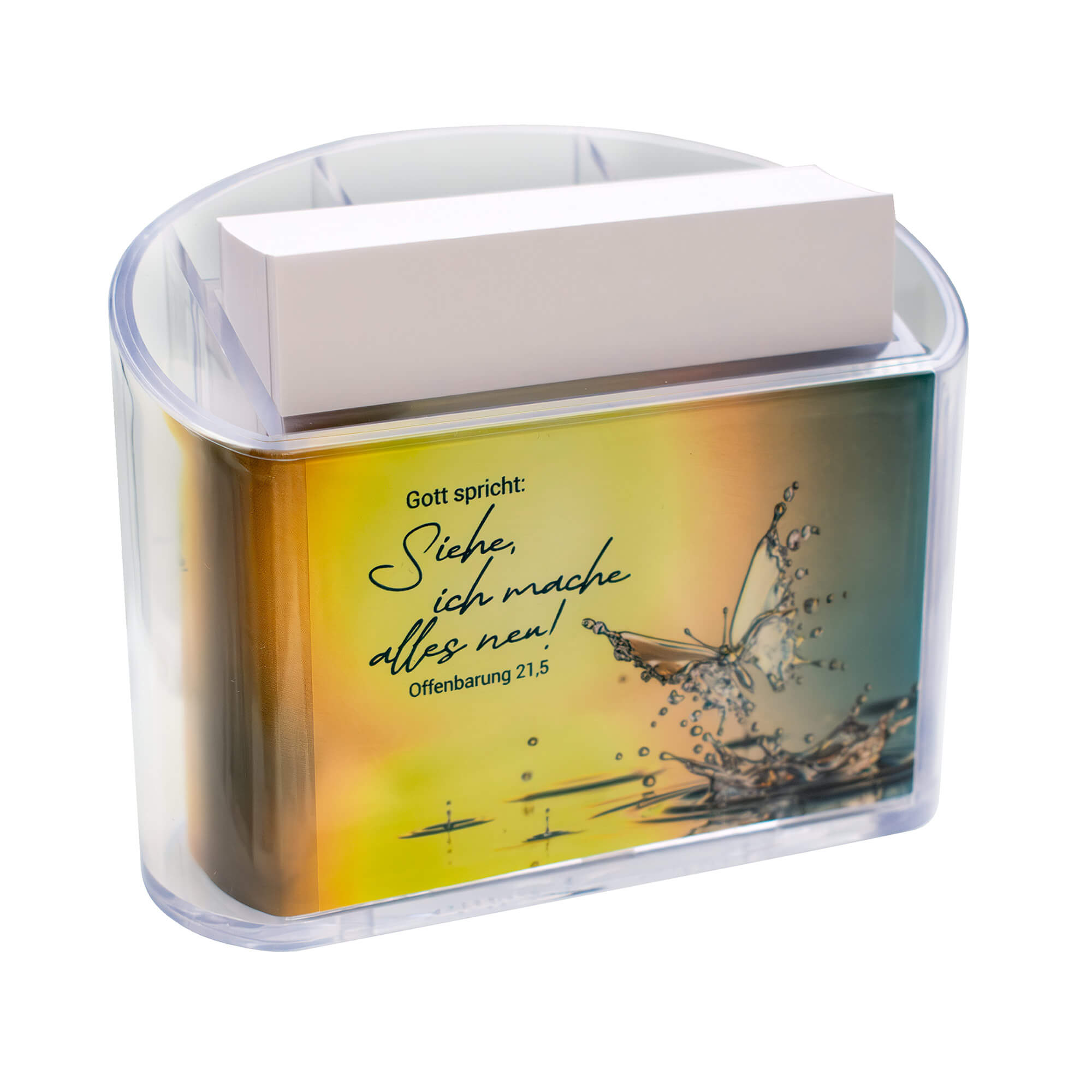 Praktische Zettelbox aus Plexiglas mit Rundumeinleger, bedruckt mit dem Motiv der Jahreslosung 2026.  Inkl. Stifteköcher und 210 Notizzetteln. Größe: ca. 11 x 9 x 6 cm.